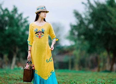 產(chǎn)品設(shè)計(jì)理念:旗袍是我一直鐘情的,一直也想擁有一款有趣而不失得體的旗袍款,改良版旗袍滿足了我這種需求,明媚的黃色,唯美的湖藍(lán)色,碰撞出視覺色彩,虎頭刺繡躍然于胸前,帶著一份俏皮卻又不失民族風(fēng)韻味。不規(guī)則的袖口,隨性自然,純手工盤口,古典優(yōu)雅,裙擺飄逸靈動(dòng)?!?/p>