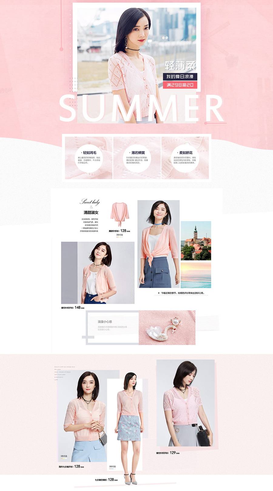 尚都比拉女裝活動(dòng)頁(yè)面設(shè)計(jì)案例是由1912做的女裝活動(dòng)頁(yè)面設(shè)計(jì)案例之一。采用錯(cuò)落的圖文排版法進(jìn)行網(wǎng)頁(yè)設(shè)計(jì)的。中心主題是我的夏日浪漫,要有輕薄柔感。采用了前粉色和淺藍(lán)色來(lái)提現(xiàn)夏季的服飾清爽和浪漫氣息。