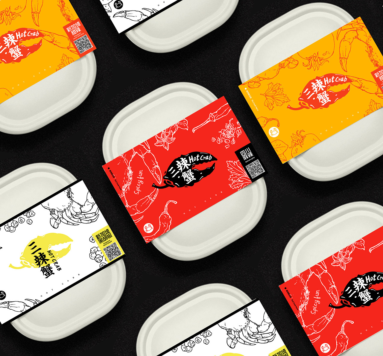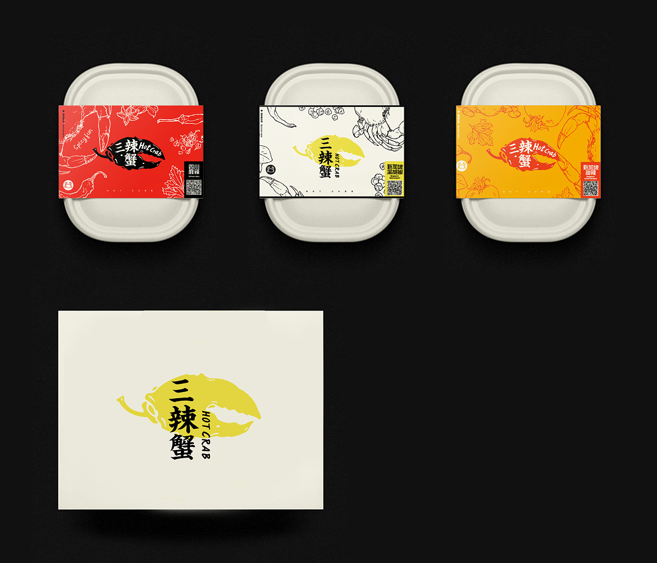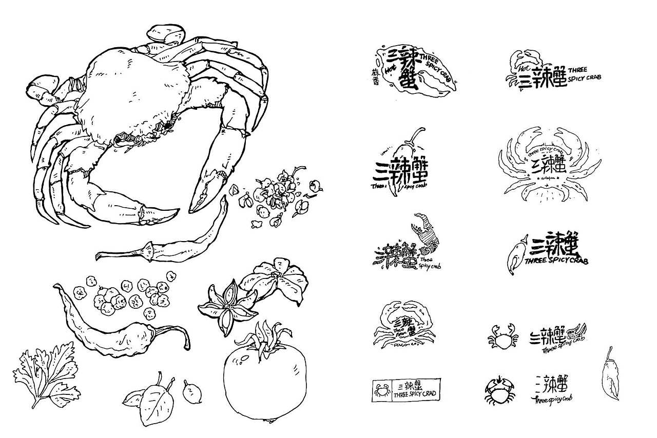 客戶起初找到我們的時(shí)候,希望是突出做蟹的行業(yè)特征但又不想要太俗氣。通過(guò)跟客戶充分溝通后,我們抓住了螃蟹鉗和辣椒的特征兩者結(jié)合,然后將logo的名稱嵌于形狀內(nèi),有別于傳統(tǒng)logo的做法,更多的偏向了西式涂鴉的感覺(jué)。在后期的圖形延展上面,我們畫(huà)了一些特定口味的插圖以配合到包裝應(yīng)用上,讓整體形象更加提升。