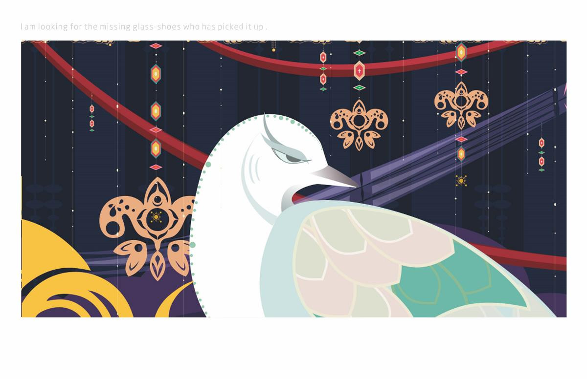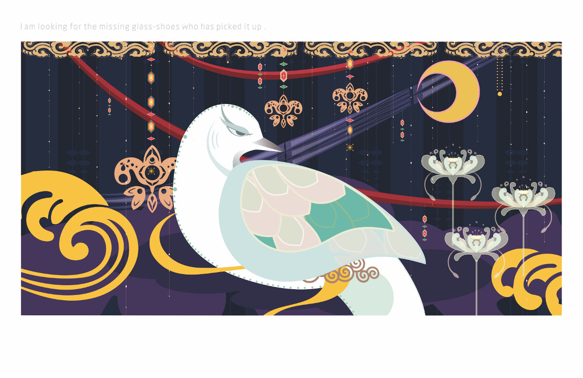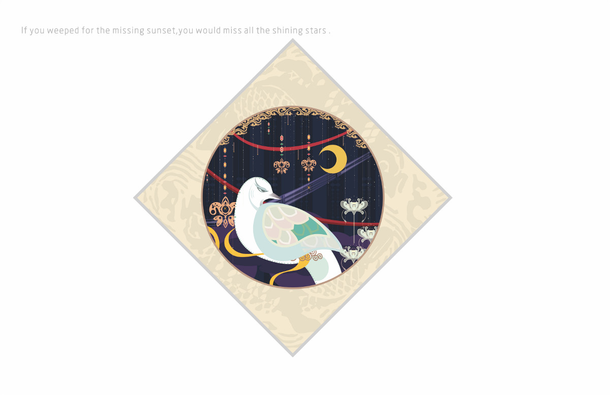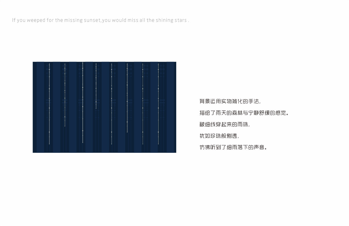 設計靈感來源于,中國剪紙畫,和現代插畫做結合。整個設計想體現出干凈,清透的視覺感受。夜鶯的神態(tài)溫柔又安慈,雨珠一串串的從空中落下,仿佛可以聽見滴答滴答的聲音。夜鶯伴隨著深夜的雨,在森林中吟唱著美妙的歌.....