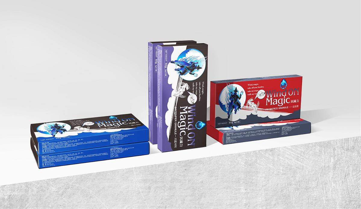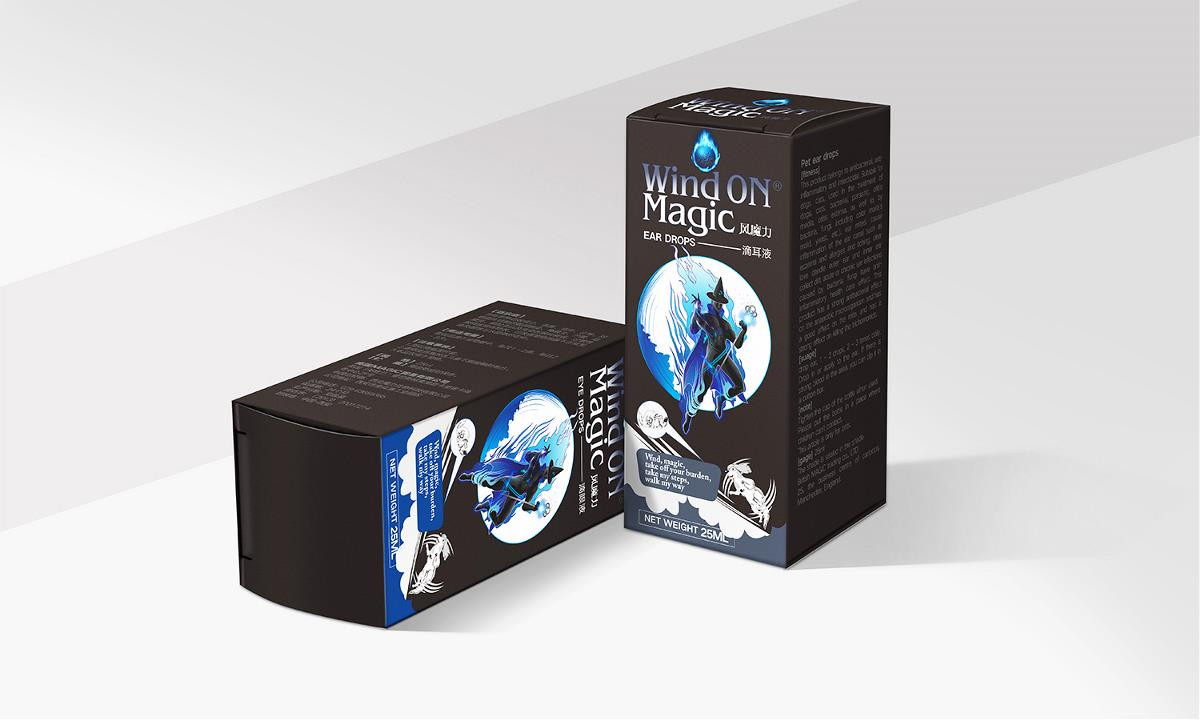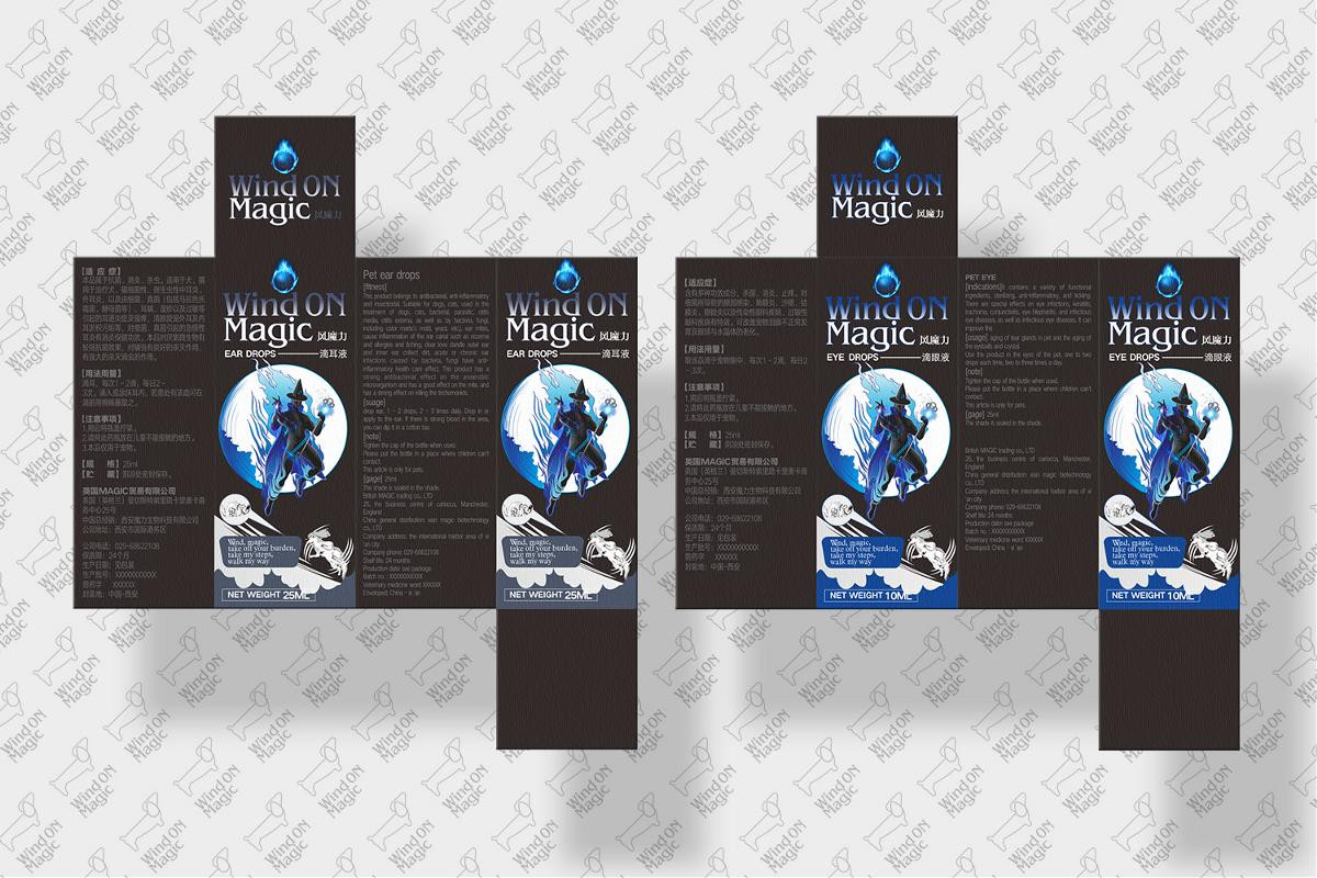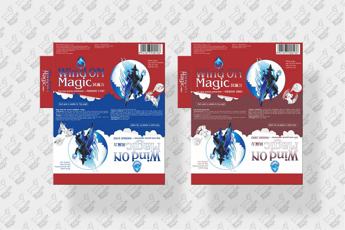 寵物藥品包裝設計主要針對寵物貓和寵物狗,為了強調這一點,包裝的正面添加了貓和狗的形象,并通過死氣沉沉,無精打采與迸發(fā)活力,精神四射做了用藥前后的對比,并結合魔法師的圖形,很生動的傳達了產品的功效。