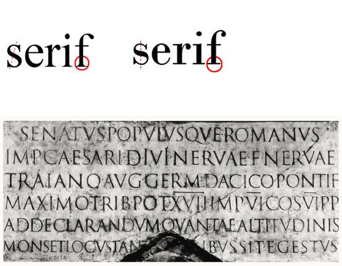 筆畫末端付加油爪狀或者線條叫襯線,據(jù)說襯線有助于水平方向的視線移動,所以小說等正文排版中會更多的使用傳統(tǒng)造型的羅馬字體。文藝復(fù)興時(shí)期到巴洛克時(shí)期的老羅馬體,18世紀(jì)后具有直線型襯線的現(xiàn)代羅馬體。