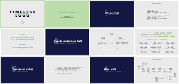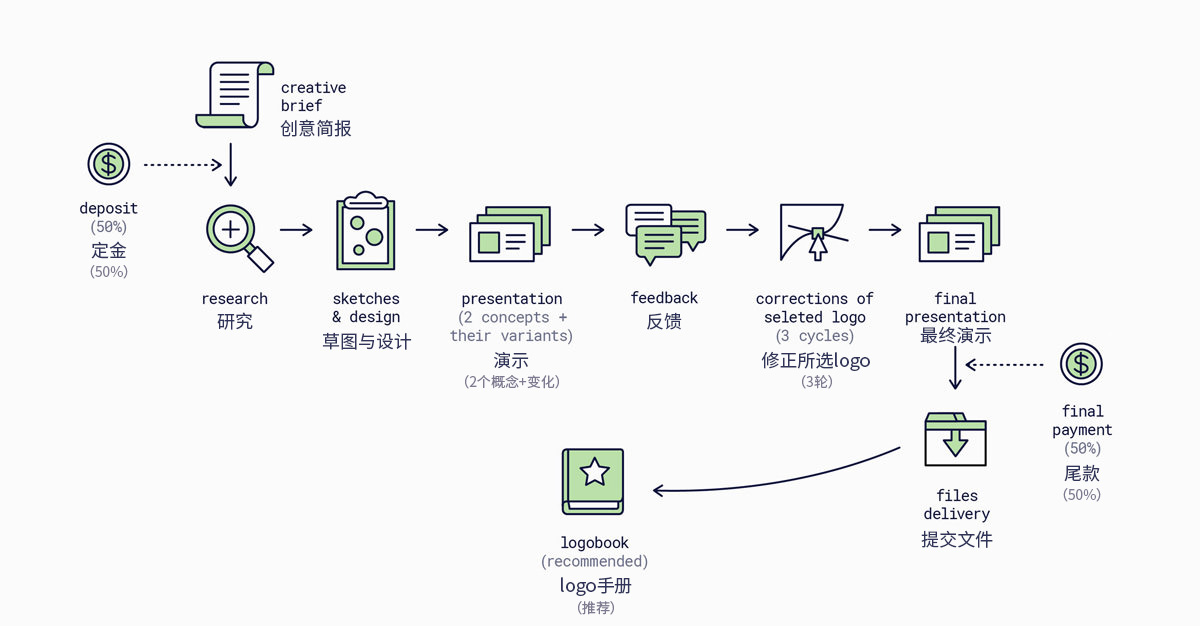 盡可能讓你客戶理解和信任這套流程。第一次會(huì)議時(shí)向他們展示(當(dāng)然,要視覺化),并且解釋為何遵循它是如此重要。首次演示就要明確你將要交付的Logo方案數(shù)量、修正和修改次數(shù),還有付款和交付時(shí)間節(jié)點(diǎn)。