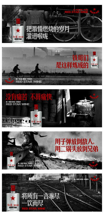 該系列平面廣告?zhèn)鞒辛思t五星時(shí)代的意氣風(fēng)發(fā),重溫了酒桌上盟友的肝膽相照。廣告畫面?zhèn)€性鮮明,文案更是熱血豪氣。紅星二鍋頭,不僅僅擁有其特有的酒桌文化,更是承載著一部分人對(duì)那個(gè)時(shí)代的深刻感懷,越是物資匱乏的年代里越是催生經(jīng)久不衰的友誼,朋友之間來(lái)上一瓶,既是把酒,更是交心。