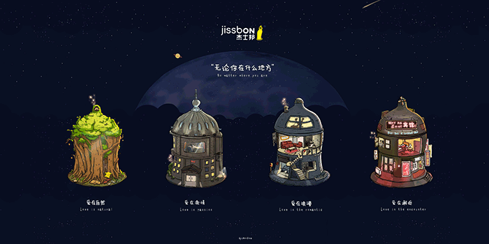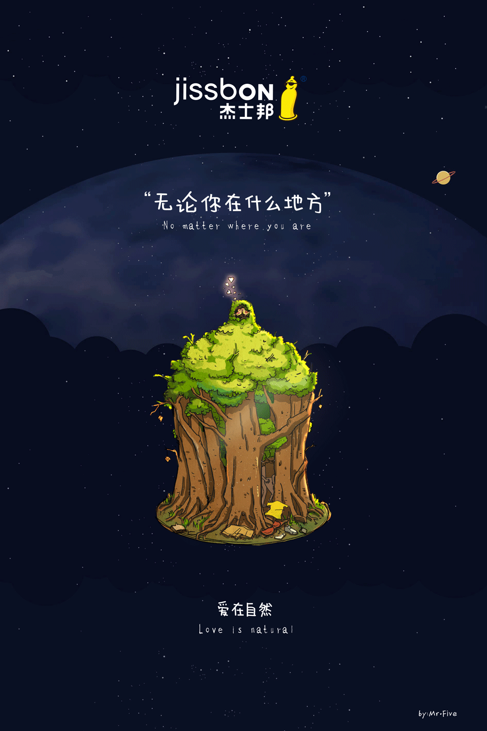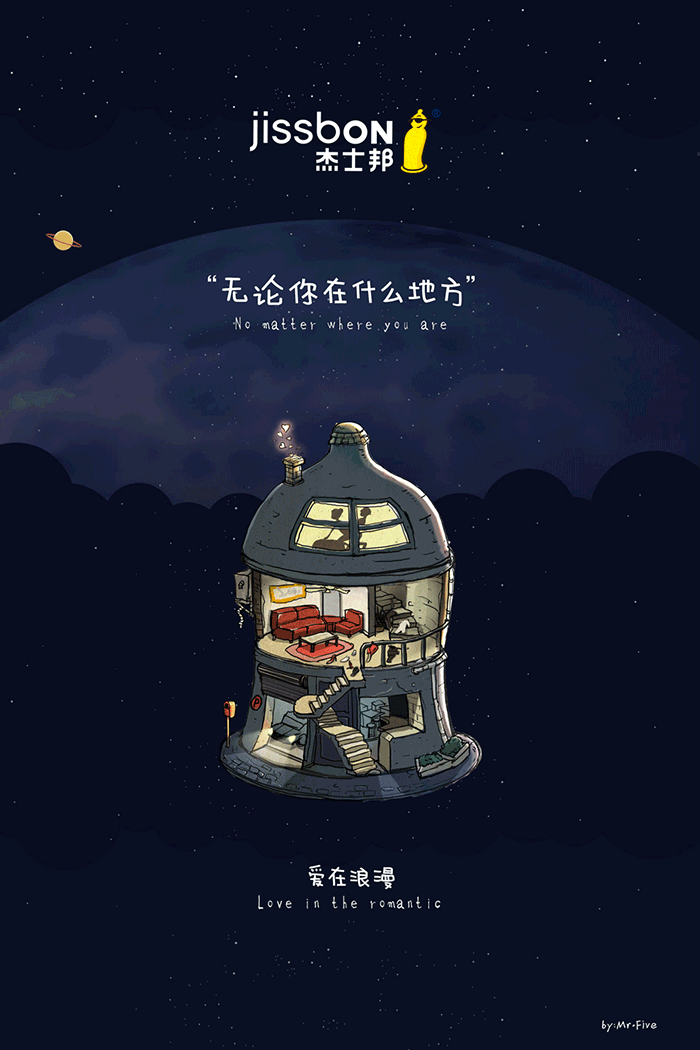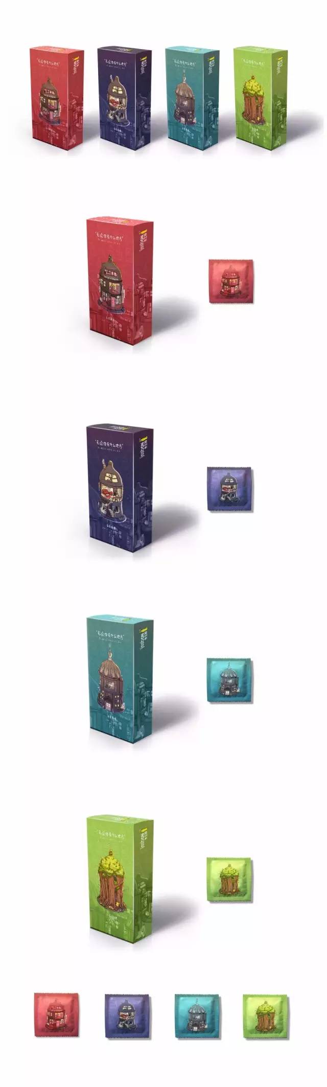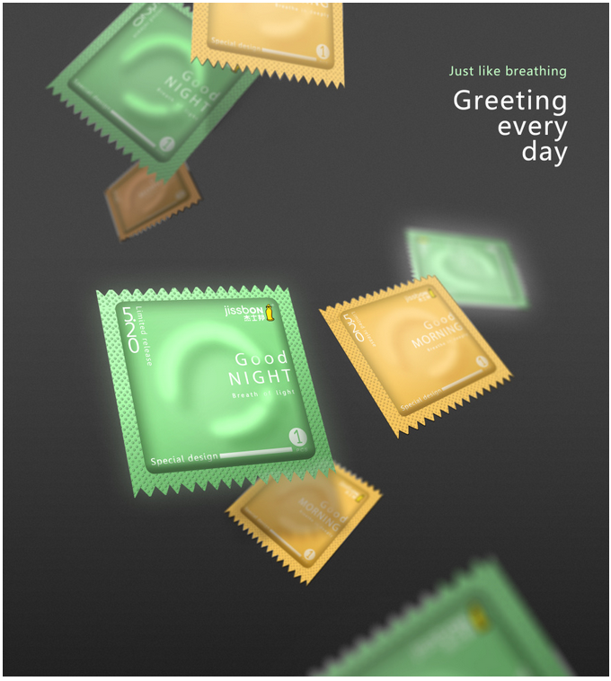 無(wú)論你在什么地方,在家里、在公司、在賓館、在刺激的野外……以套套的形狀將這幾個(gè)代表性的地點(diǎn)(泛指任何地點(diǎn))表現(xiàn)出來(lái)。這幾個(gè)地點(diǎn)(建筑物和小樹(shù)林)都象征著套套,在每個(gè)地點(diǎn)(每個(gè)套套)里面都上演著不同的情景、迸發(fā)不同的激情,但都享受著這“套套”給予的安全保障。