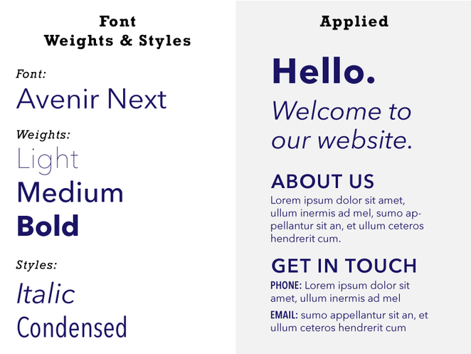 許多字體都有一系列版本可供選擇,比如細體、粗體、斜體、長體等等。這些選擇大大減輕了工作負擔,即使你只選擇一種字體,這種字體的的其他版本選擇也足以用來組織文本并創(chuàng)造有效對比。而且你還可以試著調整字體大小或顏色來設置另外的對比。