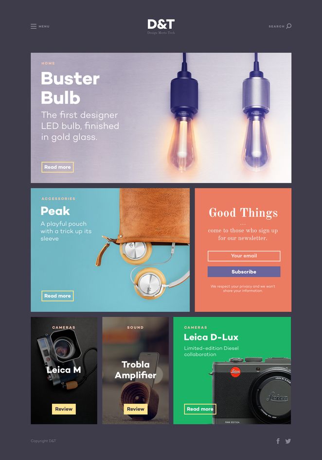 之前提到的比例分割法發(fā)揮效用的一部分原因在于它是出人意料的,它達到的不是整齊劃一的典型效果。驚喜的元素使用是創(chuàng)造對比的好方法,比如在一個平淡的設計中加入明亮的顏色就能打破整齊劃一的感覺,從而吸引觀眾的興趣。