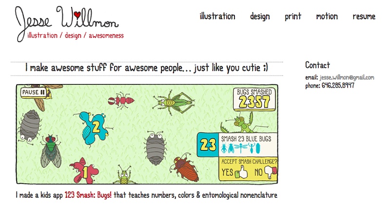 Jesse Willmon所有的設計作品都融入了自己的個性,她用“我”和 “你”這兩個人稱迅速與觀眾建立起直接的交流,而且還加入大量幽默元素來展示她的作品。她的插畫式設計和對話風格都非常獨特,整個網(wǎng)站看起來充滿了趣味與隨性,讓人一看就愛上。