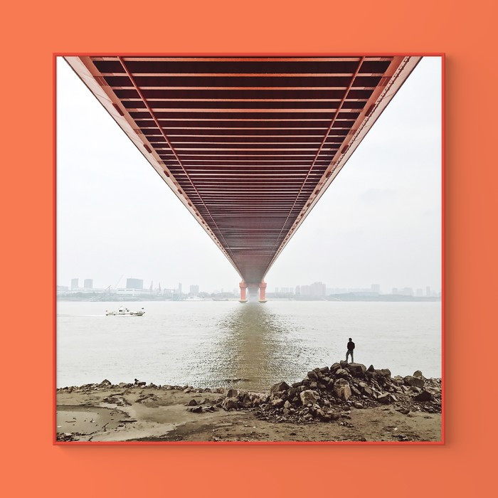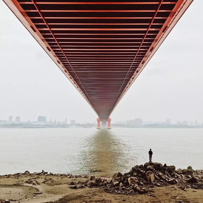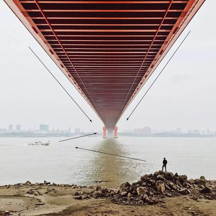 下圖是快艇出現(xiàn)之前的場景,人物在右且朝右看,導致畫面左半部分沒有重點,如果以橋墩為對稱點的話,構圖上照片雖做到了對稱,但所展示的內(nèi)容,顯然還是右邊更多,且視覺運動軌跡是割裂的存在,沒有連續(xù)性。