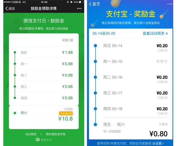 微信錢(qián)包推出了鼓勵(lì)金活動(dòng),線下使用微信支付可以獲得鼓勵(lì)金,每周四累計(jì)的鼓勵(lì)金可點(diǎn)擊翻倍,以此來(lái)促進(jìn)用戶(hù)使用。后來(lái)支付寶也推出了鼓勵(lì)金活動(dòng),使用支付寶支付,就可以獲得鼓勵(lì)金,而且每一筆都可以點(diǎn)擊翻倍。在支付寶推出鼓勵(lì)金之后,微信錢(qián)包對(duì)自己的鼓勵(lì)金活動(dòng)做了個(gè)更改,必須在兩分鐘內(nèi)點(diǎn)擊才可領(lǐng)取鼓勵(lì)金,逾時(shí)失效,增強(qiáng)用戶(hù)的感知。