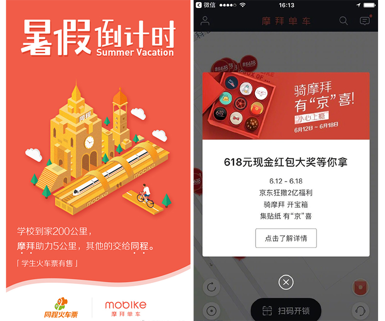 公司內(nèi)部沒(méi)有資源可共用時(shí),可以尋找外部資源,摩拜單車(chē)在做活動(dòng)的時(shí)候,就與很多公司合作,比如同程火車(chē)票APP、京東APP,通過(guò)與知名公司合作,不僅達(dá)到了資源共享,還能提高活動(dòng)的參與率,將活動(dòng)的效果最大化。