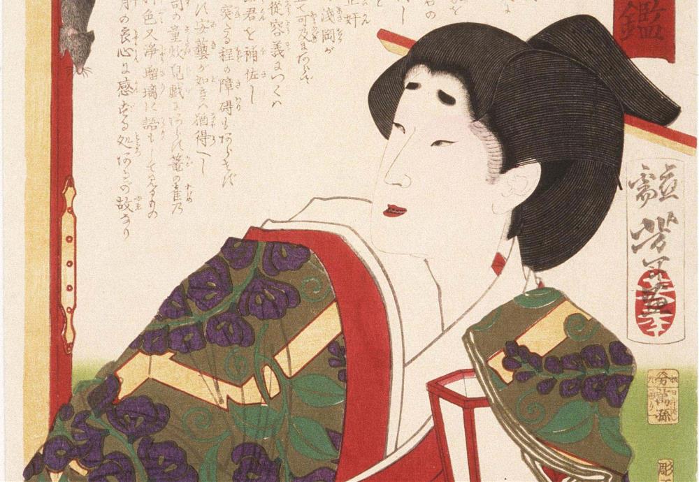 Asaoka Watching a Mouse on a Screen, woodcut by Tsukioka Yoshitoshi (circa 1875-1876).