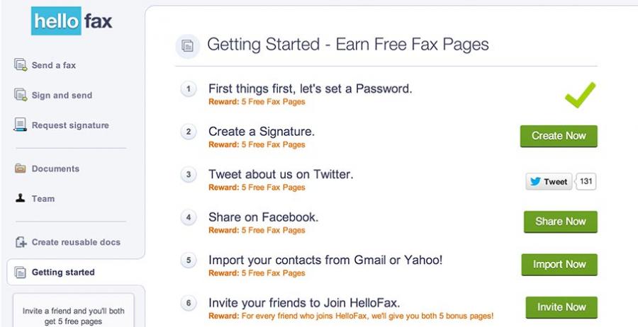 就像那些一上來(lái)就提供面包的餐館,HelloFax很巧妙地讓人們決定采用他們家的服務(wù)。他們?cè)谟脩敉瓿勺?cè)之后,還提供了一系列任務(wù),每完成一個(gè)獎(jiǎng)勵(lì)5個(gè)傳真額度。雖然注冊(cè)只需要一個(gè)郵箱地址,但設(shè)置密碼甚至都可以賺取任務(wù)獎(jiǎng)勵(lì)額度。在這個(gè)賺取額度的過(guò)程中,你和這個(gè)工具就有了共同經(jīng)歷。