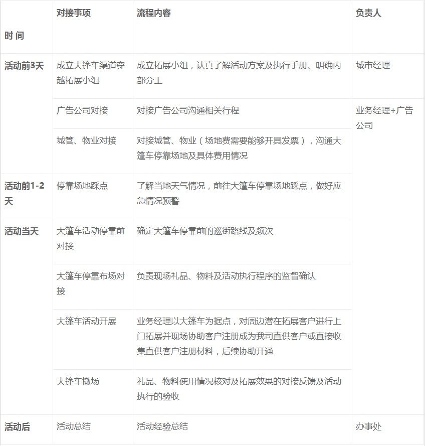 考慮地推進(jìn)度及路演效果,當(dāng)業(yè)務(wù)經(jīng)理進(jìn)行地推拓展客戶(hù)同時(shí),大篷車(chē)路演活動(dòng)將駐點(diǎn)進(jìn)行,整個(gè)地推活動(dòng)采取“陣地+游擊”的形式進(jìn)行?!按笈褴?chē)”路演的內(nèi)容如下表所示: