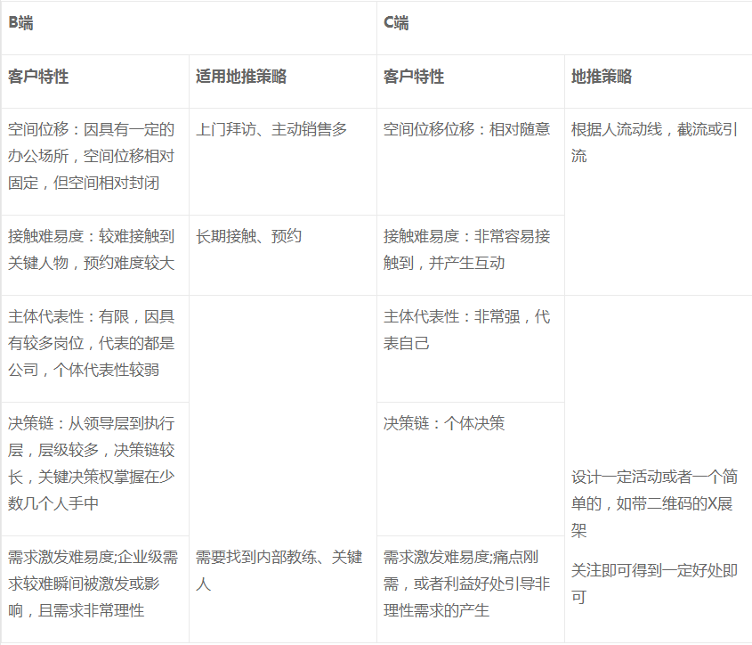 為便于區(qū)分B端和C端客戶(hù)地推模式的不同,如下簡(jiǎn)要梳理兩種不同的客戶(hù)特性和地推策略: