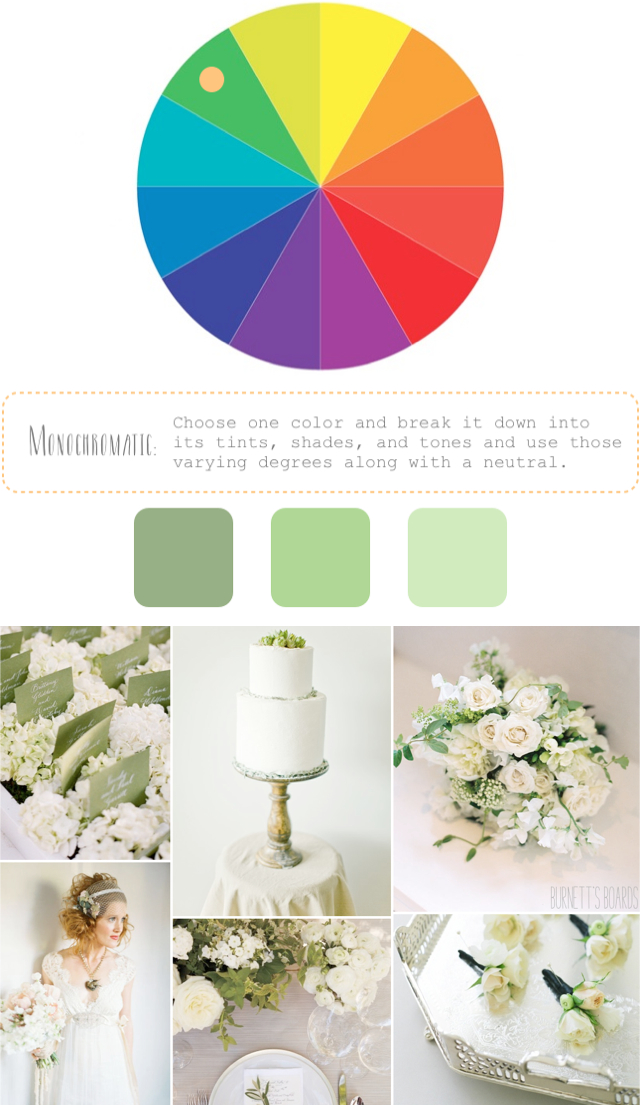 為一個單色的婚禮選擇一種顏色,然后把它分解成小家庭(PS:從色溫、陰影、色調(diào)三方面入手),并添加你的素色。我選擇綠色做主色,作用是讓人眼前一亮,白色作為輔導(dǎo)的素色。單色婚禮我絕對喜歡,因為做好之后它看起來既別致又復(fù)雜。