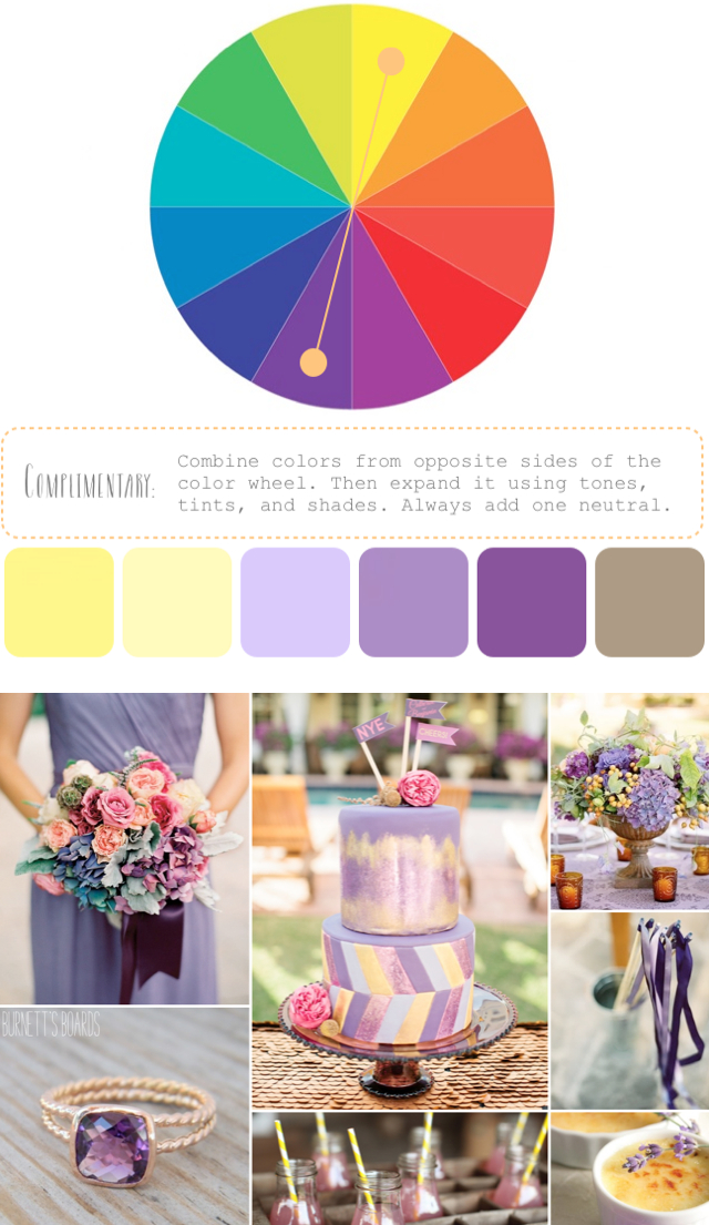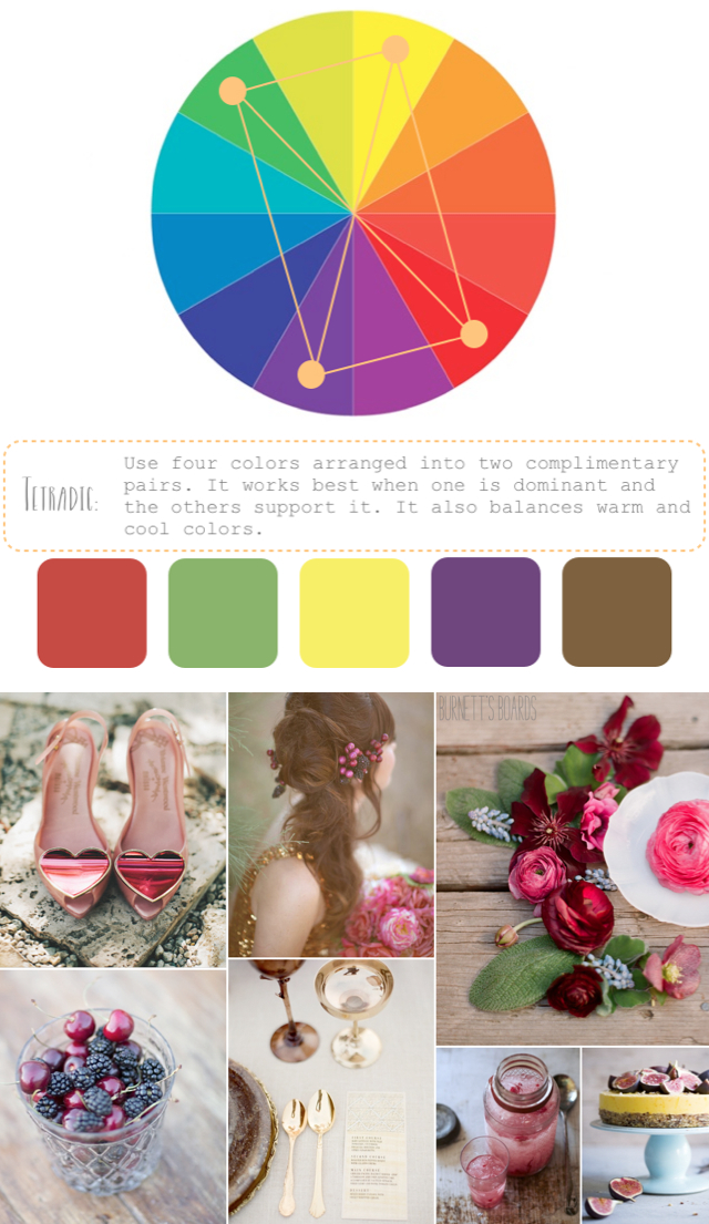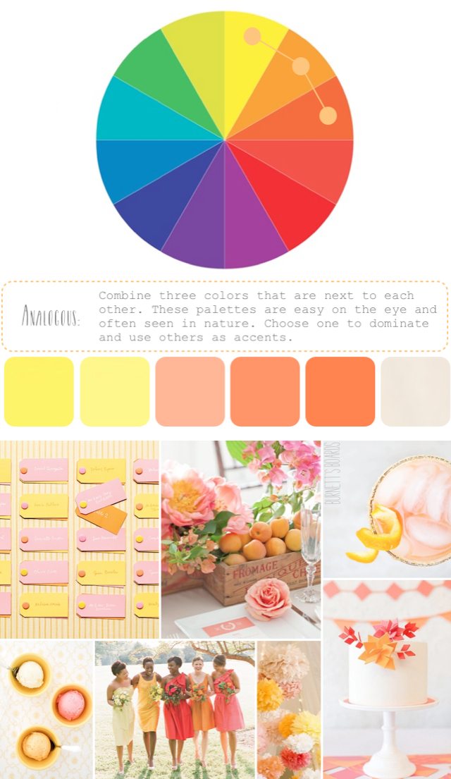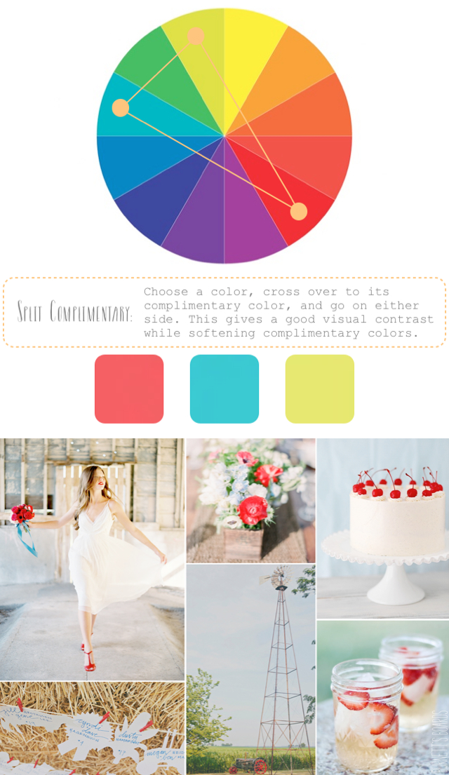 用活潑多樣的顏色組合制作一個三色配色方案,三種顏色在色輪上要呈正三角分布,例如黃色、藍色和紅色。這三種顏色正好是三原色——但如果你想婚禮看起來級別高點兒千萬別直接用,你要把每一個顏色按色溫、陰影、色調(diào)分成小家庭,然后與你選擇的素色搭配,做成你愛的樣子~