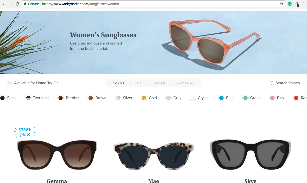 最佳解決方案包括色板和常用顏色標(biāo)簽的組合。WarbyParker網(wǎng)站的眼鏡就是一個(gè)很好的例子。