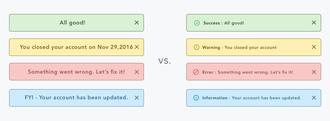 不僅僅是表單,提醒消息也是。我們往往傾向于將成功和失敗的消息分別顯示為綠色和紅色。但使用諸如“成功”之類的前綴文本或圖標(biāo)可以快速輕松地閱讀,如下所示: