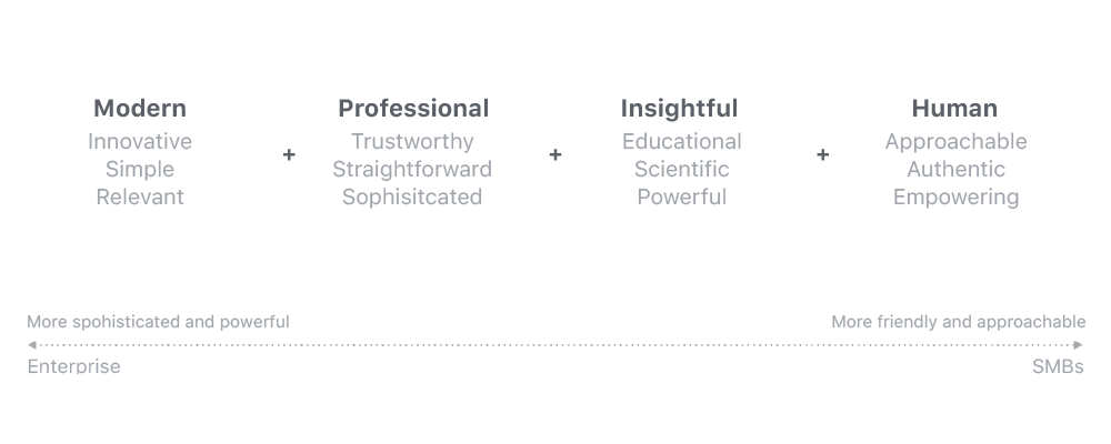 我不知道最終這個設(shè)計系統(tǒng)會是什么樣子,但是我清楚它一定不能太精確,不能限制得過死。它需要是可擴展的,靈活的,并且擁有優(yōu)秀的成長性和可進化性。在真正開始視覺設(shè)計之前,我希望知道我們對于產(chǎn)品和用戶之間的交互有怎么樣的預(yù)期。我們想到了一系列不同的語匯來對其進行描述,比如人性化、專業(yè)、值得信賴、友善等。