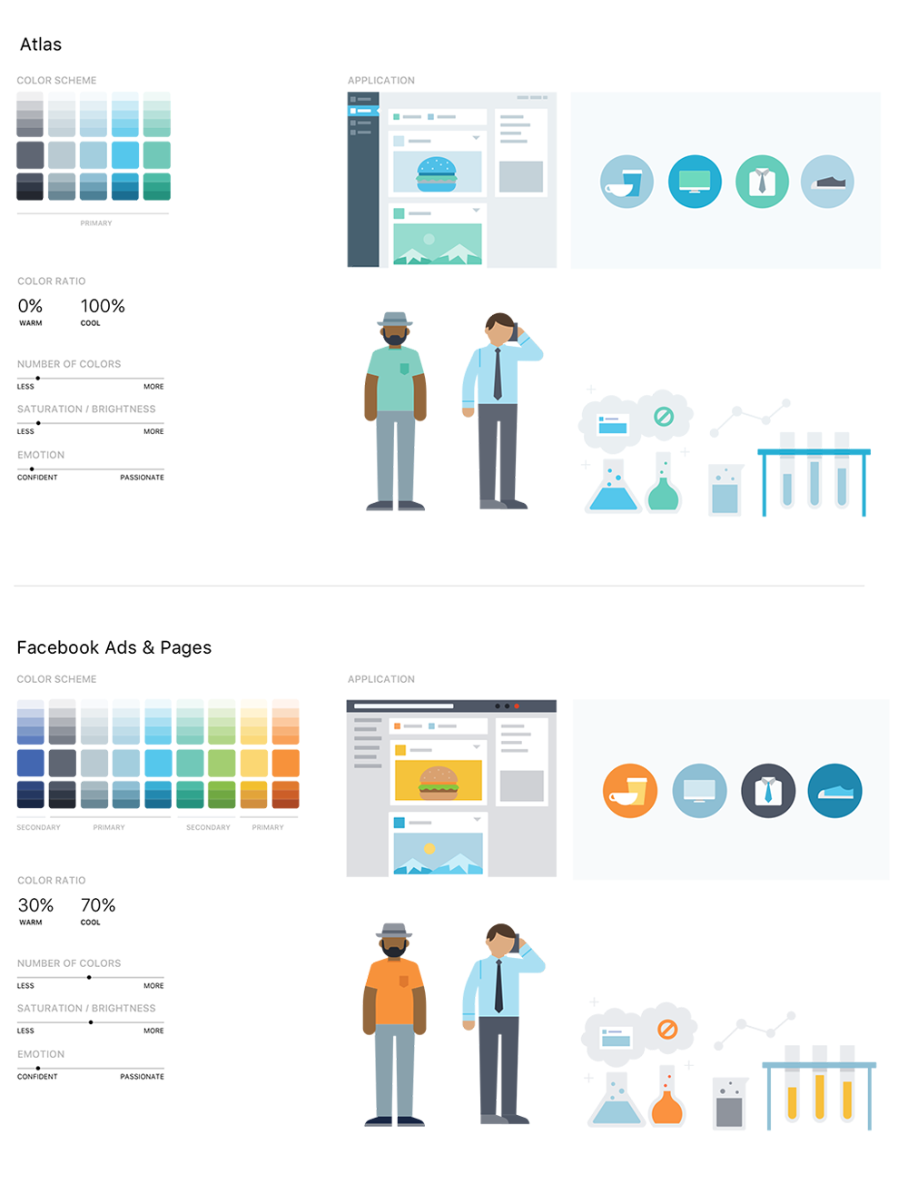 我們通過色調(diào)和色調(diào)之間的協(xié)同來強化 Facebook 的品牌,并且盡力在消費者和商業(yè)需求之間創(chuàng)造一致性的特征。在整體方案中,我們盡量讓不同的產(chǎn)品擁有不同的配色方案,創(chuàng)造出讓用戶易于辨別的明顯差異性。