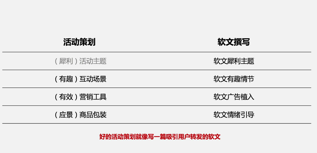 有效果的活動就像一篇能夠吸引用戶轉(zhuǎn)發(fā)軟文。