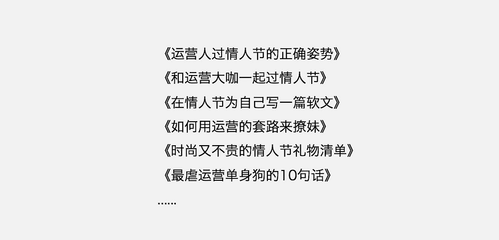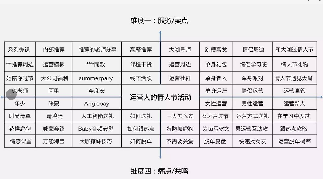 整個填寫過程可能會很痛苦,但請堅持把它填滿,因為你的爆款主題就會在里邊出現(xiàn)哦。比如我花了大概20分鐘后,把所以表格填完后,發(fā)現(xiàn)除了《追情人節(jié)熱點的*大套路》這樣的干貨文章,其實運營社其實還可以有如下主題活動主題去做:
