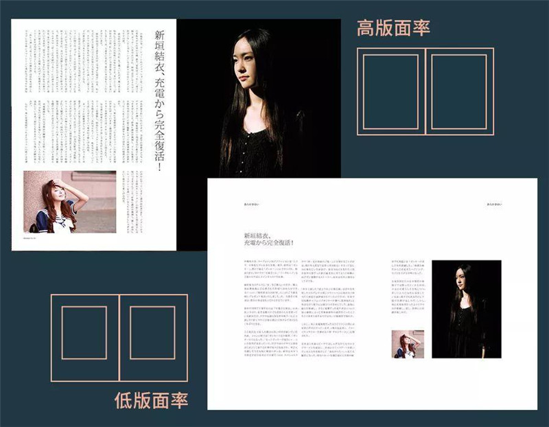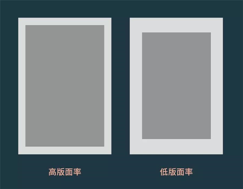 上面左圖中版心的面積非常大,四周的余白少,版面的利用率高,所以版面率就高。右圖版心面積小,版面利用率比左圖低,所以版面率就低一些。