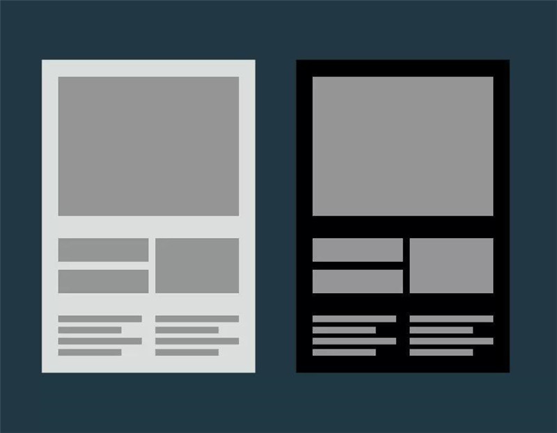 圖中灰色塊代表圖和文字信息等內(nèi)容,除去這些圖片和文字后,頁面中的其他空間都可以看作是負空間,也就是留白。當然,留白并不一定是白色,所有除去頁面內(nèi)容后的空間都是負空間,如上圖右側(cè)案例,黑色部分即此頁面的留白。