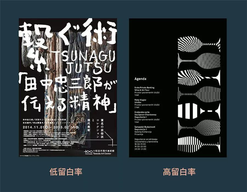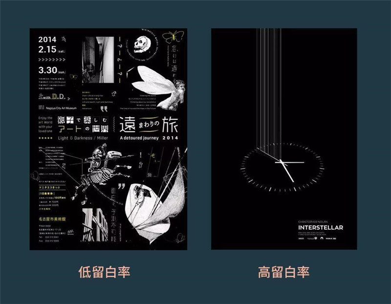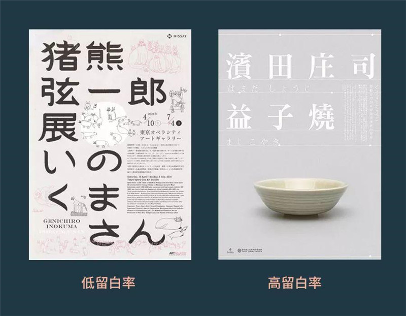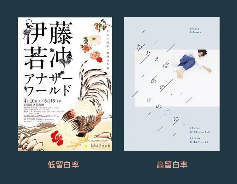 上圖中高版面率的海報相對于低版面率的更熱鬧與活潑;低版面率的則更典雅。