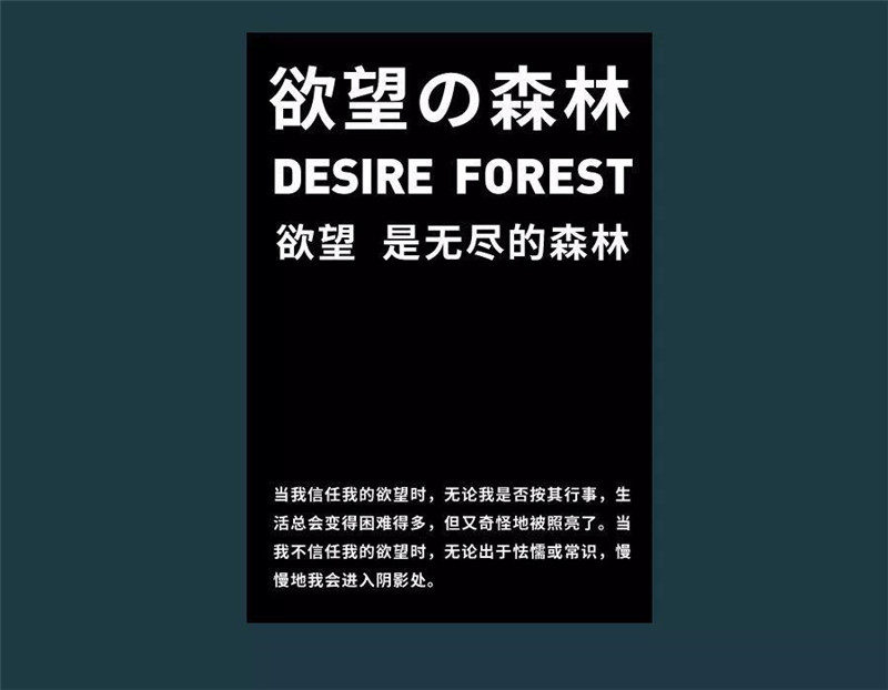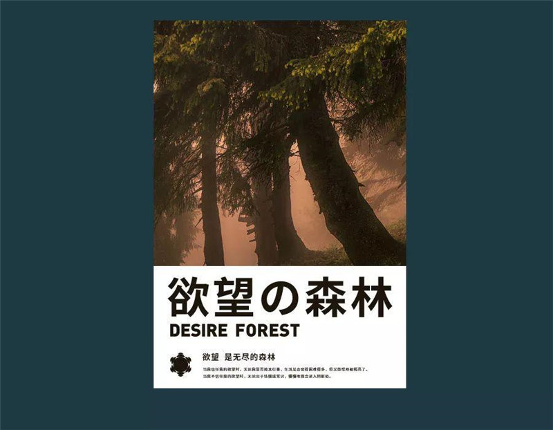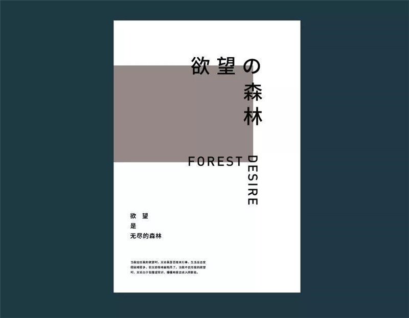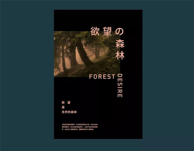 這一步我們需要把文案的層級關系拉開,大中小區(qū)分的明顯一點。這個文案的層級關系肯定是 欲望の森林 > 英文 > 欲望是無盡的森林 > 小文字信息的。